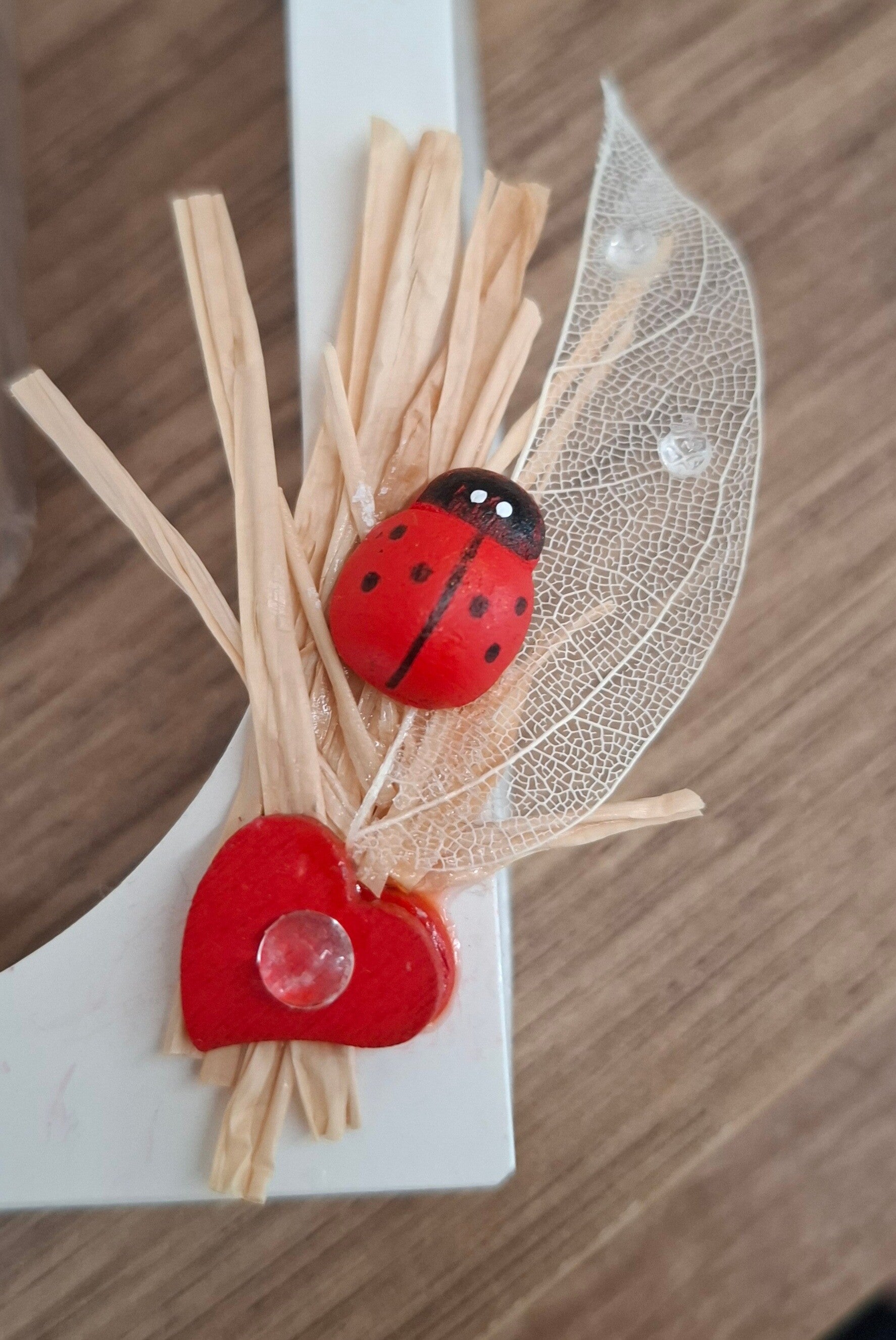 Vase orné d’un cœur avec paille, surmonté d’une 🐞 coccinelle qui grimpe sur une feuille, avec perles de rosée.